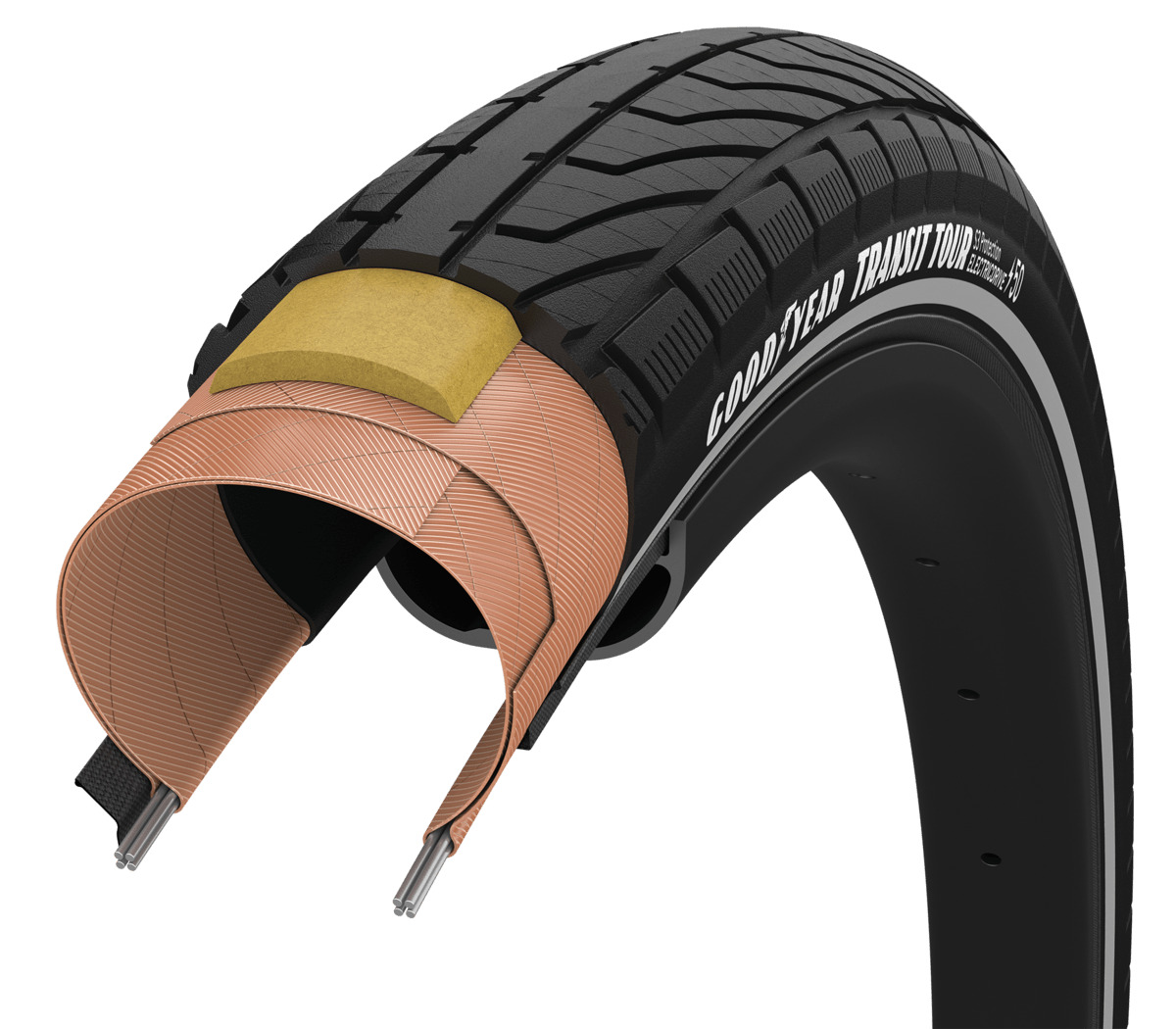- Modelled after Goodyear's Assurance All-Season automotive tyre the Transit Tour combines a durable utilitarian construction with a directional siped tread that offers unsurpassed all-weather traction. Constructed to eBike approved standards and with reflective side strips enhancing twilight and night visibility the Transit Tour provides robust flat protection along with a comfortable ride for your next journey.