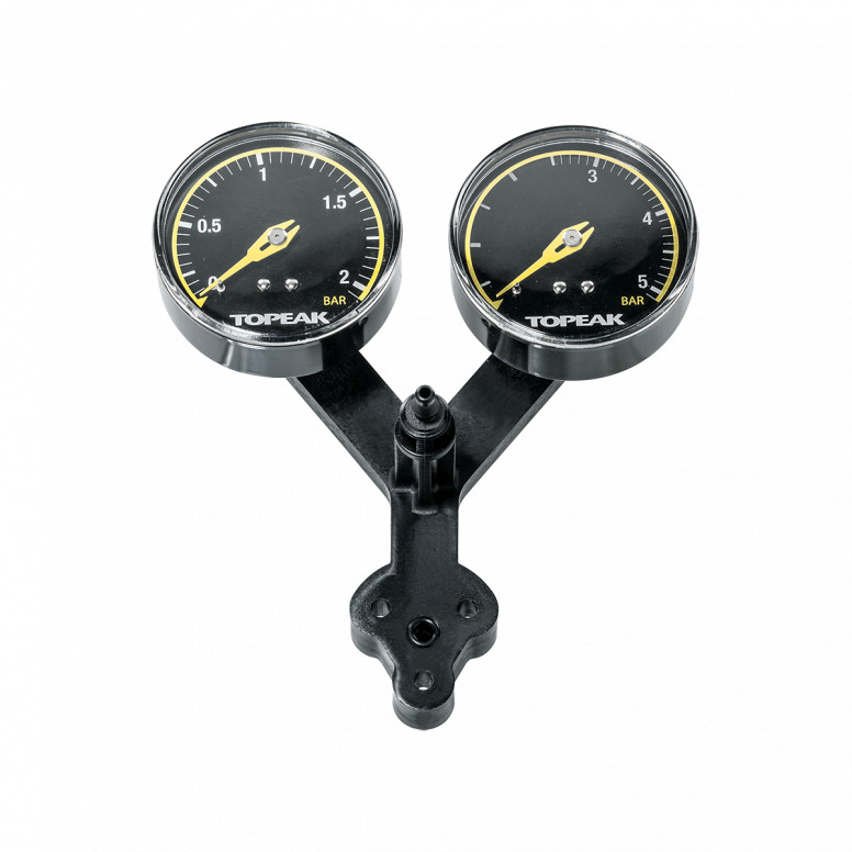 Spare gauge set for JoeBlow Dualie track pumps. This part comprises both gauges, along with the base fitting and hose junction