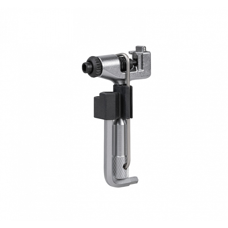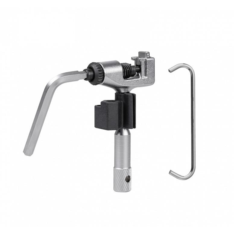 High quality, long service life, cast CrMo steel construction chain tool for single and multi-speed chains up to 13 speed, including Campagnolo® hollow pin chains. Built-in clip holds tool pieces together. Contains 4 and 5mm hex wrenches and chain hook.